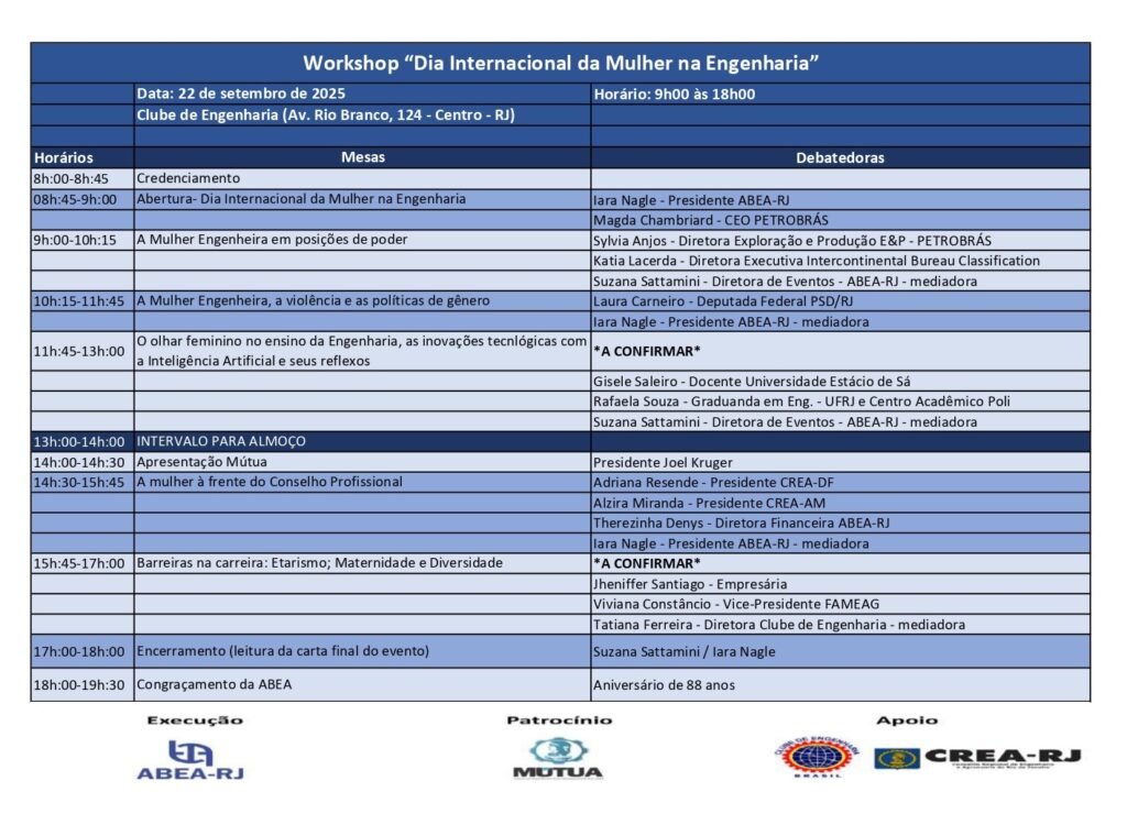 Sobre a ABEA-RJ: A Associação Brasileira de Engenheiras e Arquitetas – ABEA, é uma entidade fundada em 19 de julho de 1937 sob a liderança da notável Engenheira e Urbanista Carmen Portinho. A ABEA-RJ congrega engenheiras, arquitetas e geocientistas do estado do Rio de Janeiro. Desde sua origem, tem como missão o incentivo ao empoderamento feminino, o aprimoramento técnico-científico e a valorização da mulher na sociedade. Atua como catalisadora de ideias, promovendo o intercâmbio de conhecimento entre profissionais de todo o Brasil, com foco na excelência, na ética e na responsabilidade social.